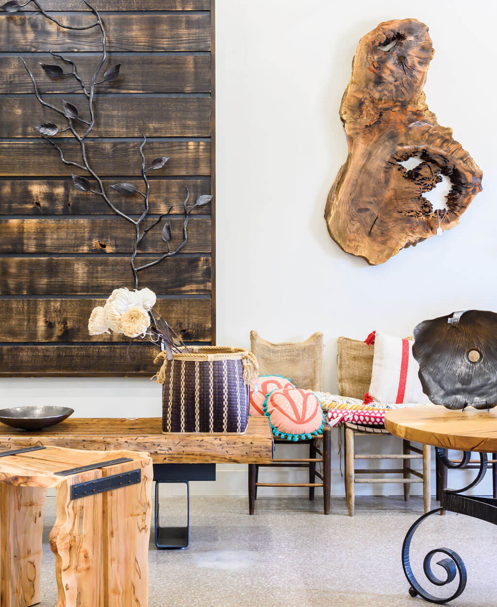 Lynn brings her eye for design to Dean’s creations, and she played a role in Oak Hill’s expansion into woodworking in 2013. “We’d seen a bunch of trees that had come down, and the limbs had been sawed off for firewood, but the trunks were headed to the dump,” she says. At the time, natural-edge furniture designs — tabletops and other pieces that retain the shapes of the original wood — were growing in popularity, and the style fit well with Dean’s rustic metal art. “We thought, ‘What would happen if we started sawing wood here?’”
