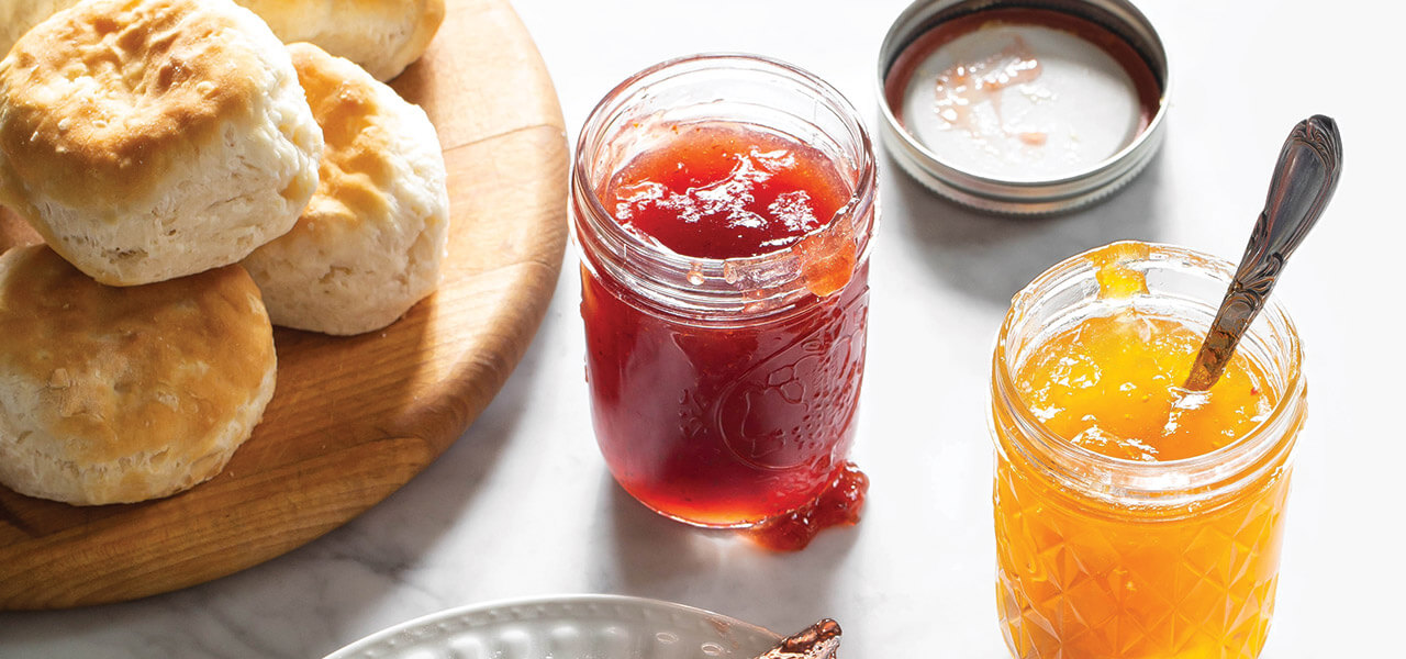 Peggy Rose Newsome grew up on a farm and learned to make preserves at a young age. Her signature product, pepper jelly, is a Southern tradition with a twist of cranberry or ghost pepper, best served simply with cheese and crackers. A jar of champagne mustard completes the spread.