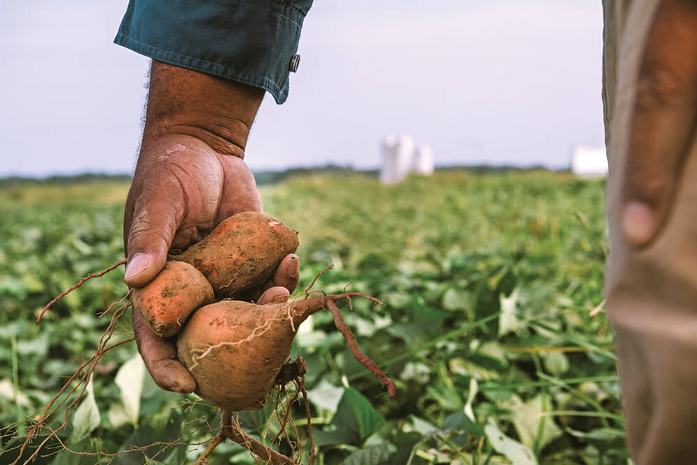 This year, Brown hopes to harvest 300,000 pounds of sweet potatoes for food pantries. He’ll save some for himself, too. “Sweet as candy,” he says of the taste. photograph by Andrew Kornylak