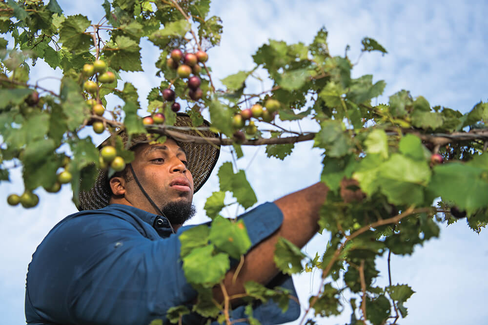 Jason Brown works a muscadine vine in a beat-up straw hat. He’s too busy to patch the holes in it, he says. photograph by Andrew Kornylak