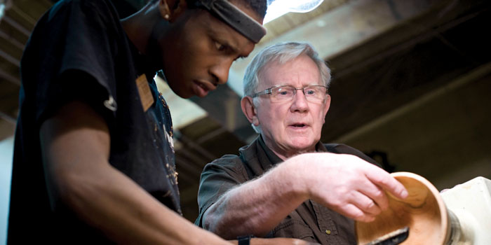 Jeffrey Davies watches nearby. The 75-year-old native of Wales and the high school student from Wilmington form an unlikely pair, bonded over a common language of spindle gouges.