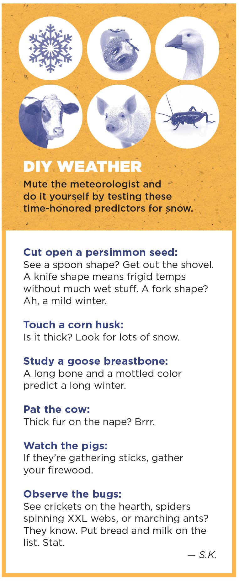 “They’ve called it hokey, and they’ve called it baloney, and they’ve said some real other words that I wouldn’t use in my house,” he says. Yet many believe him, especially since he predicted the freak-cold winter of 2009 and ’10. He called it way back that summer, when he saw a black squirrel and a score of other hints in the woods outside Boone.