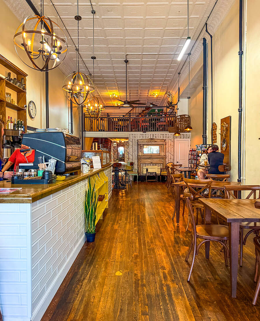 Settle in with a cup of coffee under warm lights and soaring ceilings at The Gilded Pear. Photography courtesy of Johnston County Visitors Bureau