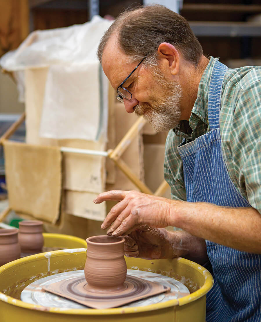 The couple earn time on the wheel by making cups. Together, they’ve made more than 200 for this year’s event. Both are thrilled to be giving back to a tradition they’ve enjoyed for so many years. “There’s just a warm feeling about it,” Fought says. “It connects people to the potters, the place, and the community.”