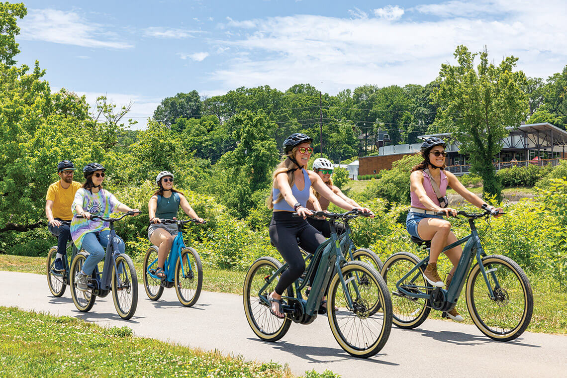 E-bikes are powering a quiet revolution in two-wheeled transport, making even challenging, hilly environments accessible to more riders. Devin Deholl, founder and co-owner of Asheville Adventure Company, calls it “breaking down fitness barriers.” His business was one of Asheville’s first e-bike tour companies. Today, it offers several e-bike tours, including a popular pub ride that takes in multiple craft breweries via local bike paths and quiet neighborhood streets. Deholl loves how e-bikes make it possible for riders of different abilities to share experiences — like, for example, grandparents and their grandchildren. And the thrill of seeing a rider on an e-bike for the first time never gets old: “They get this look on their face,” says Deholl, “and it’s almost like reliving the first time they rode a bike. That feeling of effortlessness, like someone is pushing you from behind.”
