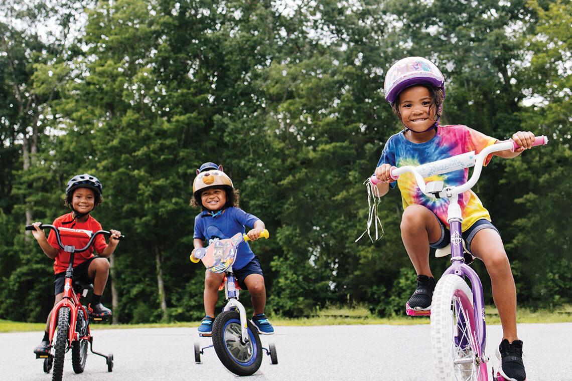 Helmets? Check. Training wheels? Check. A sunny day in Sanford for (from left) cousins Jaxon, 4, Kelan, 3, and Keilani, 5, to explore on their bikes? Check. photograph by Art by Court Winter