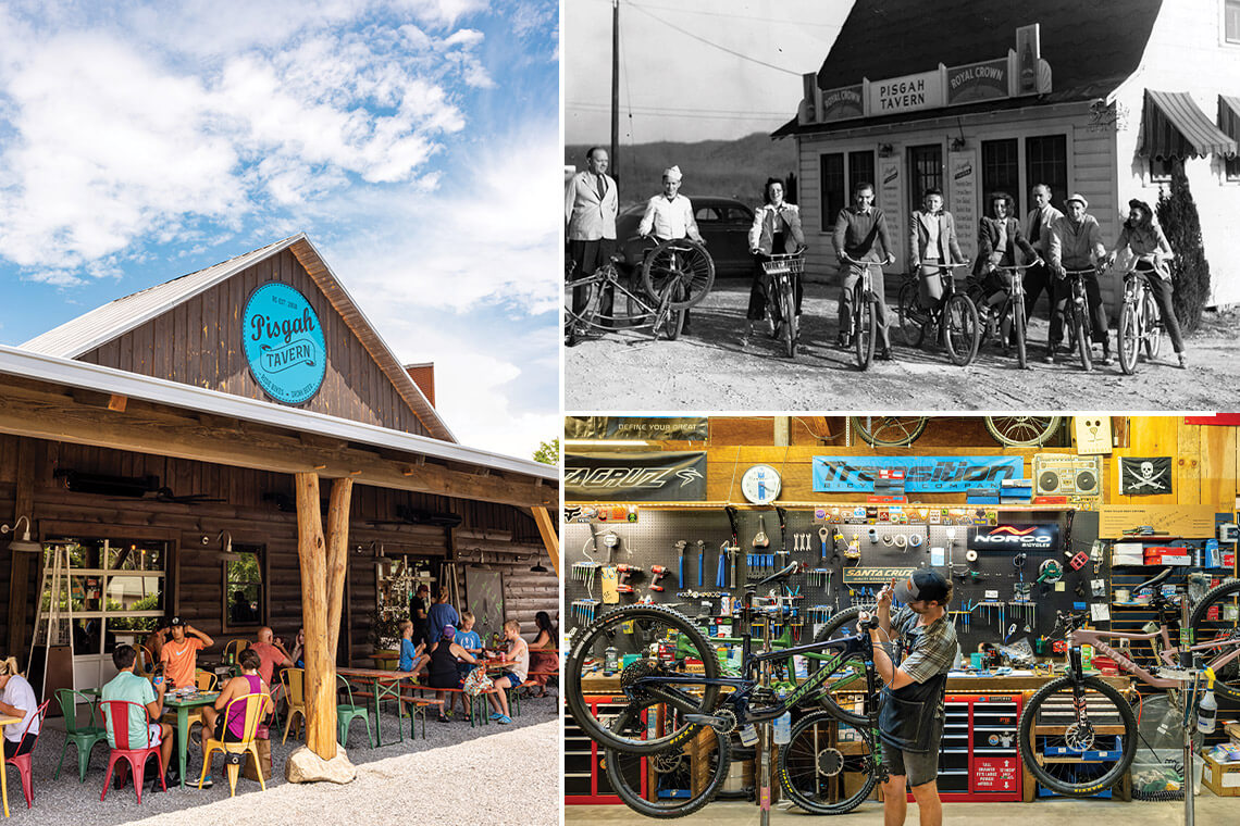 A version of Pisgah Tavern has been a destination for cyclists for more than 80 years, since back when Fred Hunter owned the original. Today’s incarnation is part taphouse, part bike shop. photograph by TIM ROBISON; HISTORICAL PHOTO COURTESY OF THE ROWELL BOSSE NORTH CAROLINA ROOM, TRANSYLVANIA COUNTY LIBRARY
