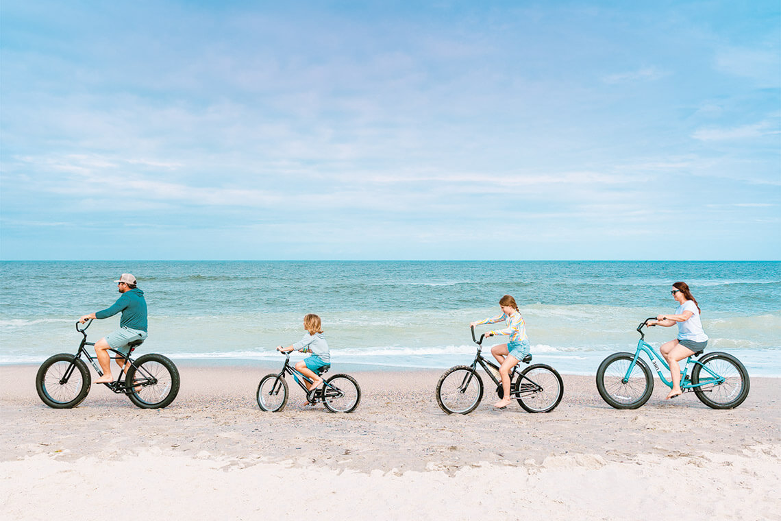 Bikes from Pleasure Island Rentals in Carolina Beach (including fat-tire bikes ridden by Mom and Dad) allow the Tluchowski family — (from left) Matt, Easton, Sophia, and LeeAnn — to roll down the beach in style. photograph by Matt Ray Photography