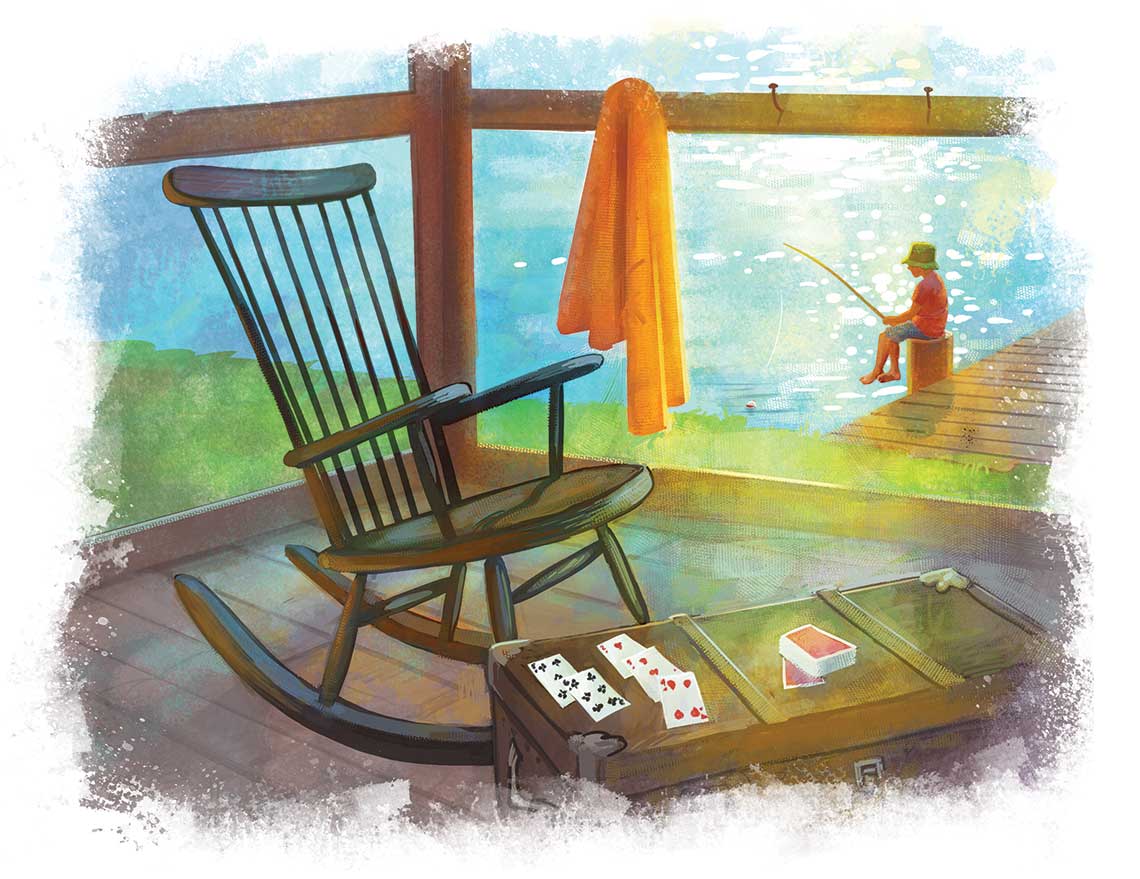 Here’s a gimme win for a cabin: cottages are three-season places. You can manage a Thanksgiving spread, but there’s not much appeal to a cottage in January. Cottages do not have fireplaces. They have porches. People in cabins live inside. People in cottages live on porches. They eat on porches and play games on porches and doze in rockers on porches — not those Adirondack numbers at cabins that you can barely haul yourself out of without a crane — and watch lizards climb the bowed-out screens on porches. Cottage people only go back inside for something else to drink or eat, from a kitchen where the stove stands alone, unattached to a counter. A screen door is always slamming somewhere in a cottage because someone’s going back outside.