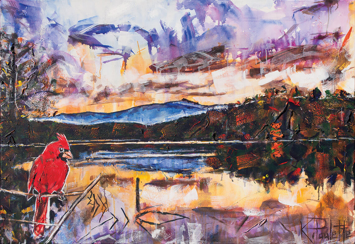 Paulette captures the vibrancy and depth of color of familiar mountain scenes through an artist’s lens, such as a cardinal at sunset in Price Lake. painting by Kent Paulette