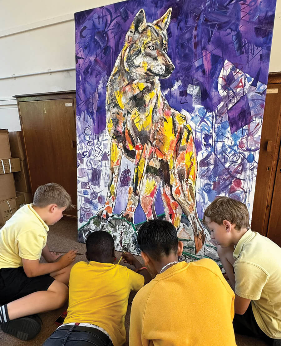 Students chose the gray wolf as a subject. So he painted one — or the beginning of one, with plenty of blank space on which the students could contribute. Then he rolled up the work-in-progress and shipped it overseas. Thus began his first-ever collaboration — with 58 British fourth-graders.