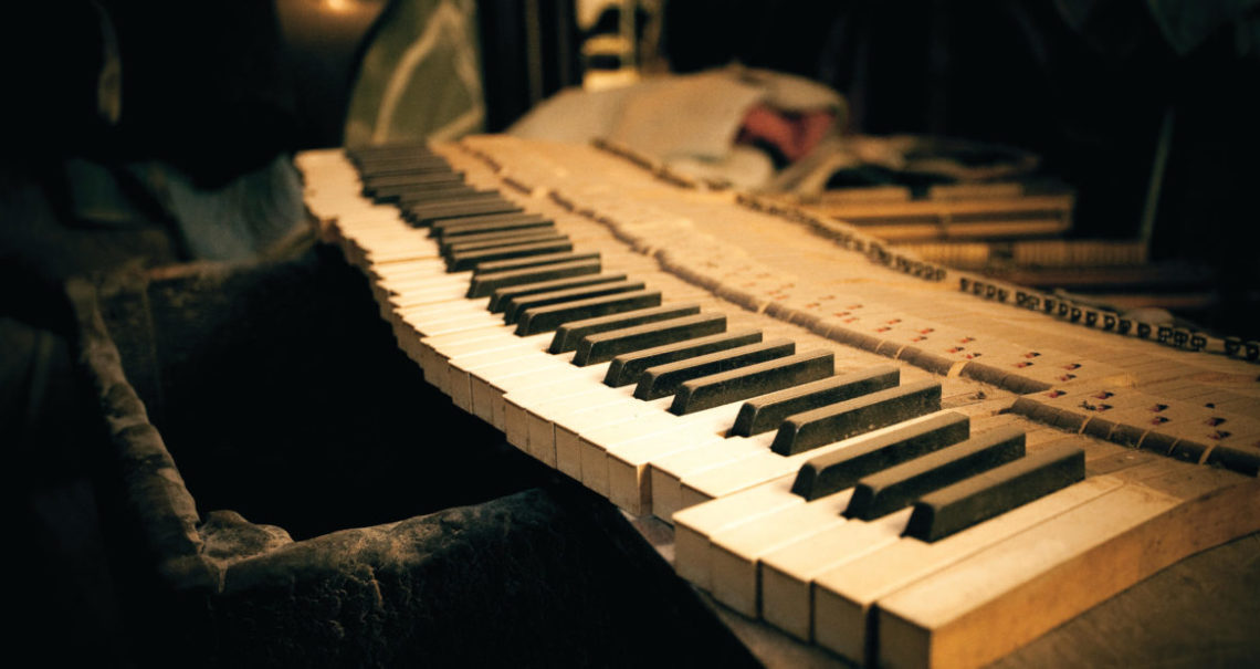 He steps over a board, turns sideways to squeeze through a row of junk, and reaches toward a weathered piano. Frayed and warped wood bends off the side.