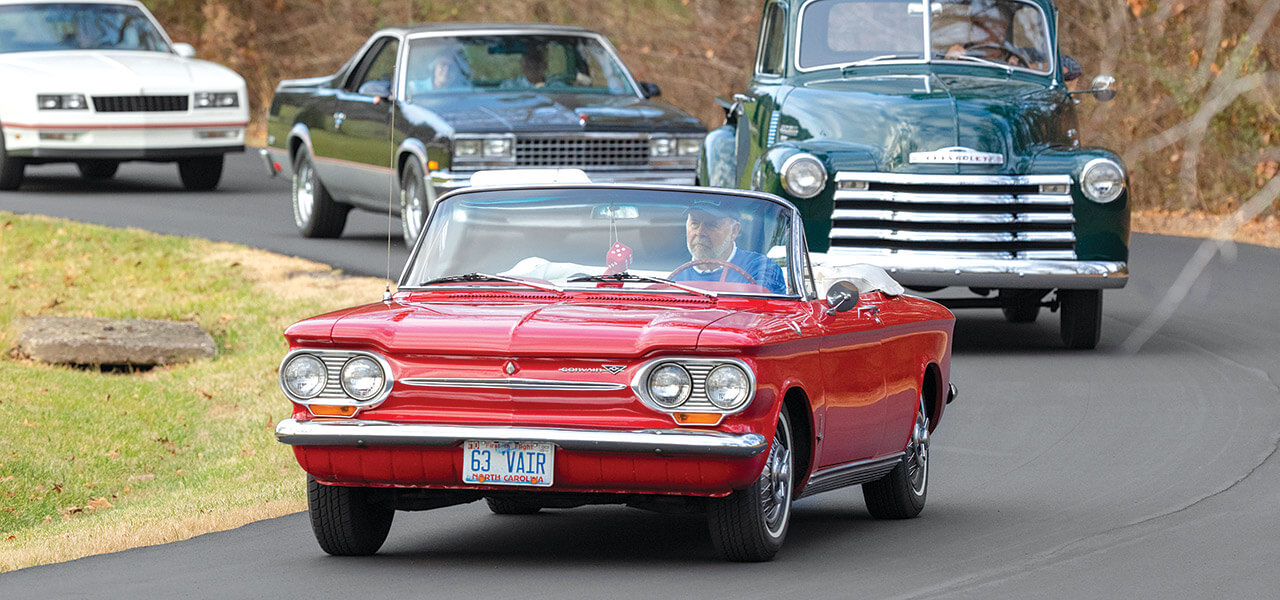 Alan went on to start the Carolina Crossroads Region chapter of the Vintage Chevrolet Club of America about 20 years ago. He built a garage behind his house that shelters nine cars from the 1950s, including not only five Chevys but also two Cadillacs and two Oldsmobiles. All are in pristine condition, their paint jobs sleek and unblemished.