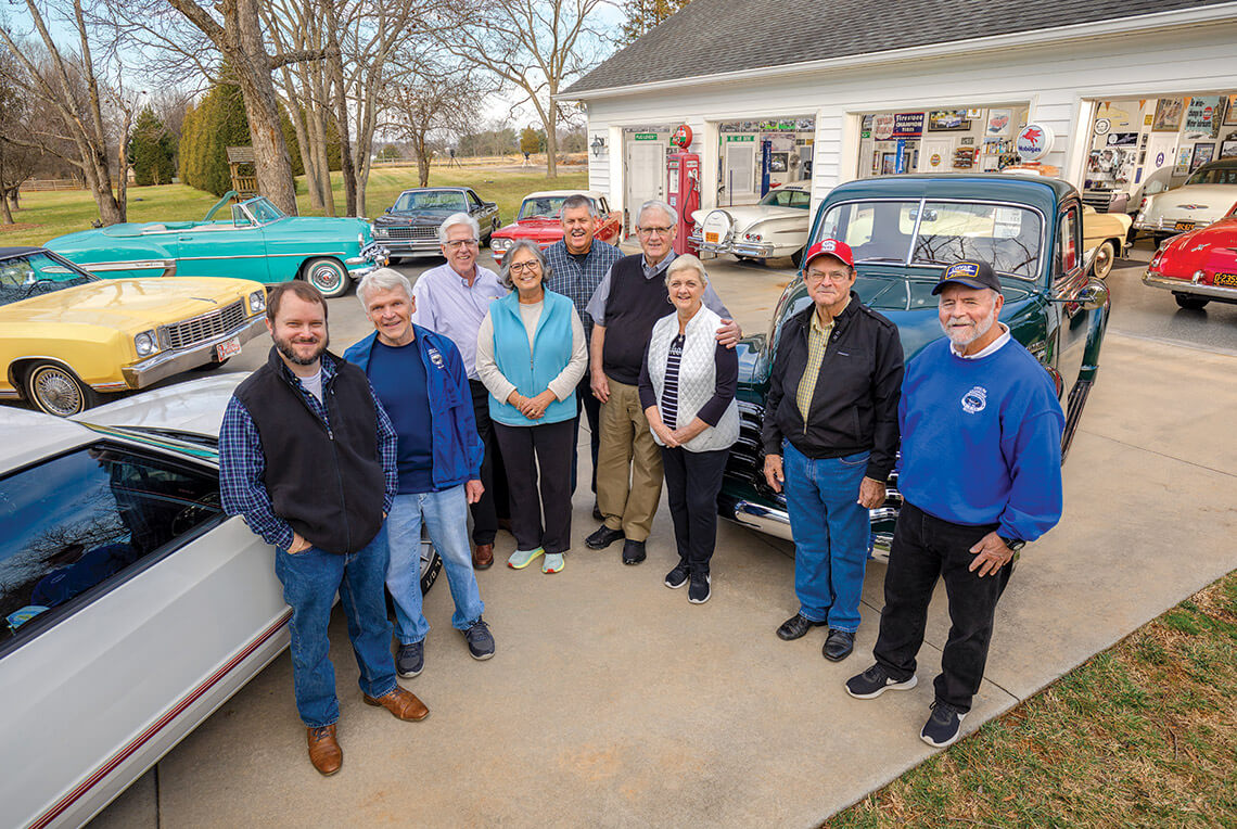 The car club often meets at the Banners’ garage. Members include (from left) Clark Adams, Chris Martin, David and Mary Puett, Dewey Bryan, Alan and Sandra Banner, Bill Adams, and Mike Parker. photograph by Jerry Wolford & Scott Muthersbaugh