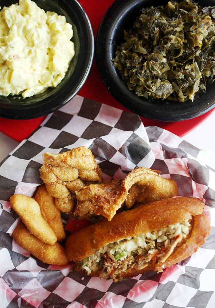 Customers return time and again for the Pig in a Puppy sandwich, as well as the restaurant’s collard greens, a side dish so delicious that King’s cooks greens in bulk to distribute to other restaurants. photograph by Travis Dove