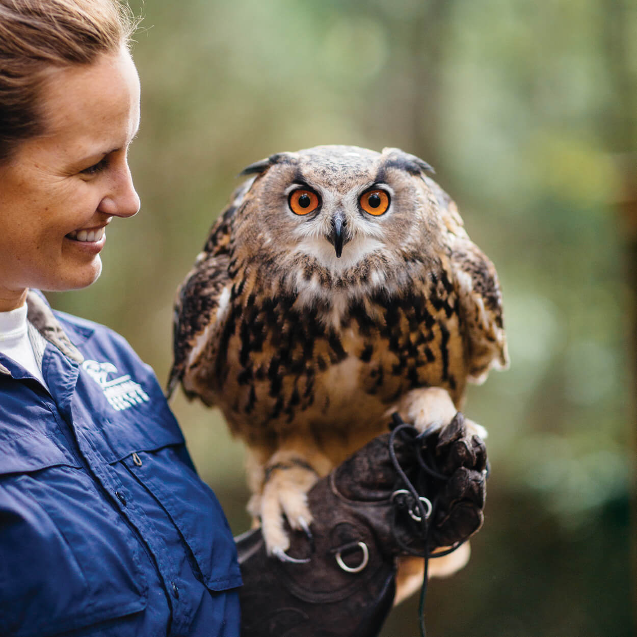 Members of the Raptor Center’s education team — including Kate Shaner, education and program manager, and Black Bart, a Eurasian eagle owl — travel to schools and libraries to spread the word on birds. photograph by Tim Robison