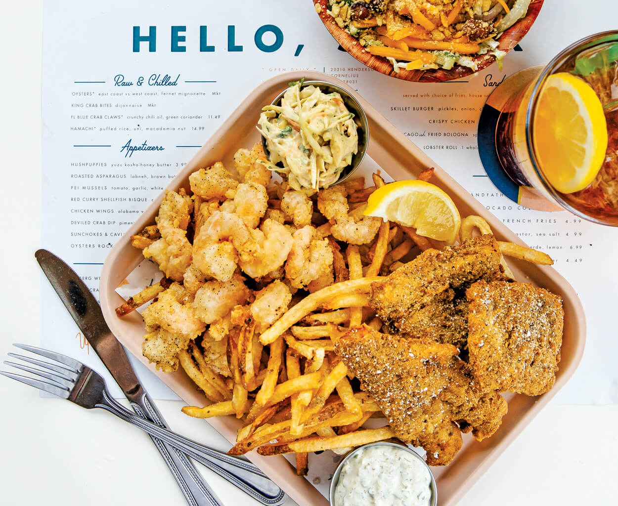 The Kindreds work with Chef Craig Deihl to pair fish-camp classics like salt-and-pepper catfish and Calabash shrimp with updated sides like avocado coleslaw and beef-fat fries. photograph by Tim Robison