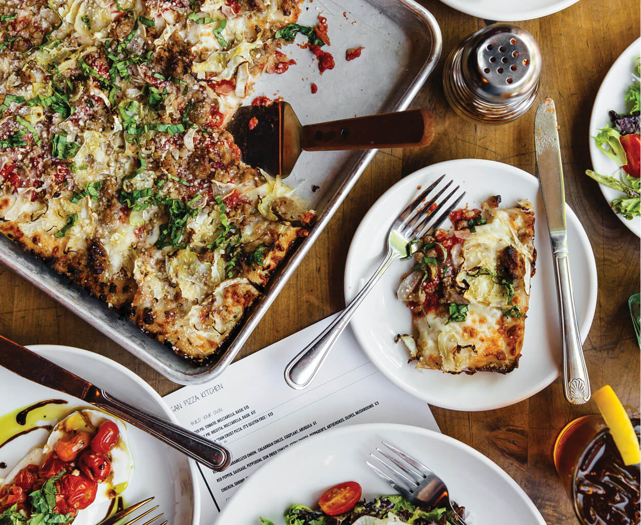 “Grandma-style pizza”? Think rectangular, baked in a sheet pan. Executive Chef Bill Schutz borrowed the idea from the nonnas of Long Island, New York, where he grew up before working in kitchens around the world and, finally, settling in North Carolina. If your grandma didn’t make a signature pizza, try Schutz’s “Pigs on a Wing”, with fennel, Italian sausage, mozzarella, and basil. And add a field lettuce salad with shaved fennel and Green Goddess dressing — Grandma would want you to eat your greens.