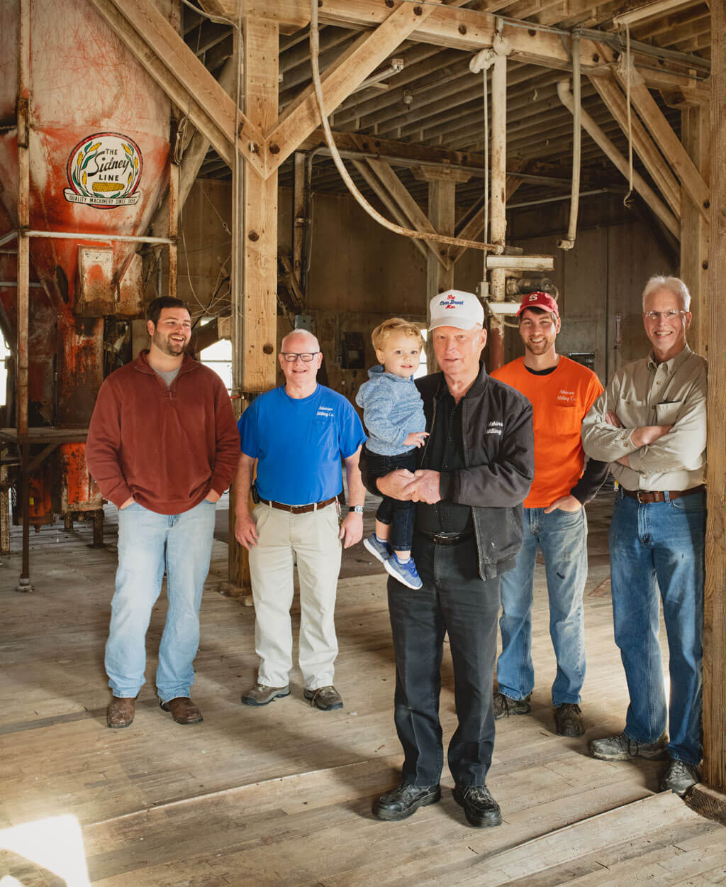 The Wheeler family in the Atkinson’s Mill building. Left to right: Andrew, Ben, Ray (holding Andrew’s son Clifton), Joseph, and Glenn. photograph by Andrew Kornylak