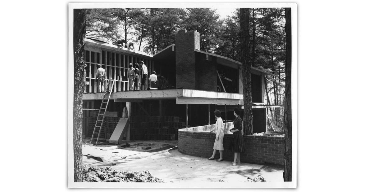 In 1958, 23 women built a house. From scratch. For a grade. Ed Loewenstein, the famed modernist architect, was teaching a course at the Woman’s College (now UNC Greensboro). The class description: Give home economics and art design majors “a real working knowledge of the problems they would face in making homes.” Loewenstein brought in professionals to assist, but the design, construction oversight, and decorating were all student-run. It was, according to Loewenstein expert Patrick Lee Lucas from the University of Kentucky, “a gargantuan project for a student.”