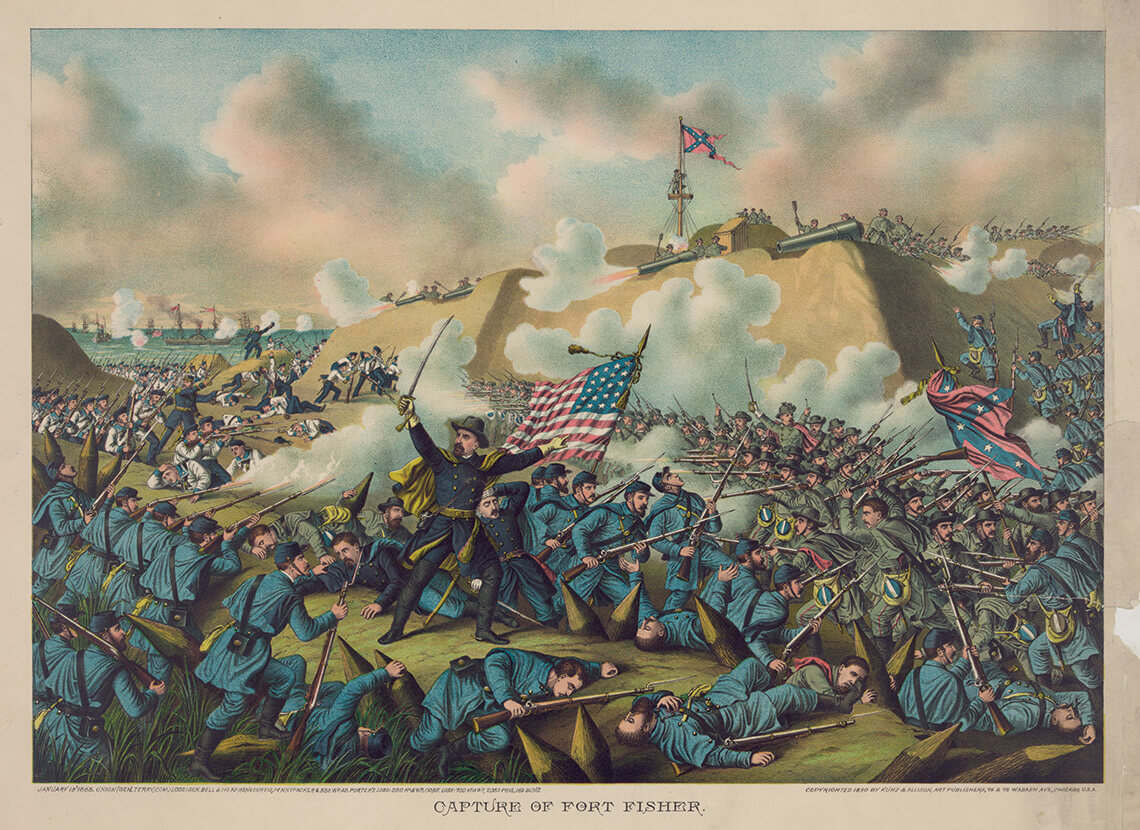 Following the First Battle of Fort Fisher, which took place during Christmas 1864, Union troops led by Maj. Gen. Alfred H. Terry successfully captured the Confederate fort during a second assault on January 15, 1865. painting by KURZ & ALLISON. CAPTURE OF FORT FISHER. CHICAGO: KURZ & ALLISON, ART PUBLISHERS. PRINTS & PHOTOGRAPHS DIVISION, LIBRARY OF CONGRESS (LC-DIG-PGA-01862)