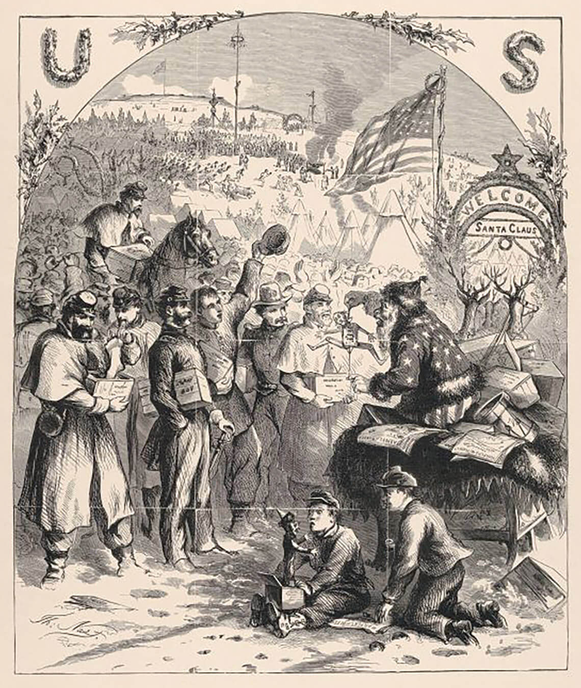Thomas Nast invented our modern image of Santa Claus in a series of cartoons for Harper’s Weekly. Beginning with “Santa Claus in Camp” in 1863, Nast used St. Nick to show his support for causes like abolition and civil rights. illustration by SEPIA TIMES/CONTRIBUTOR/UNIVERSAL IMAGES GROUP EDITORIAL/GETTY IMAGES