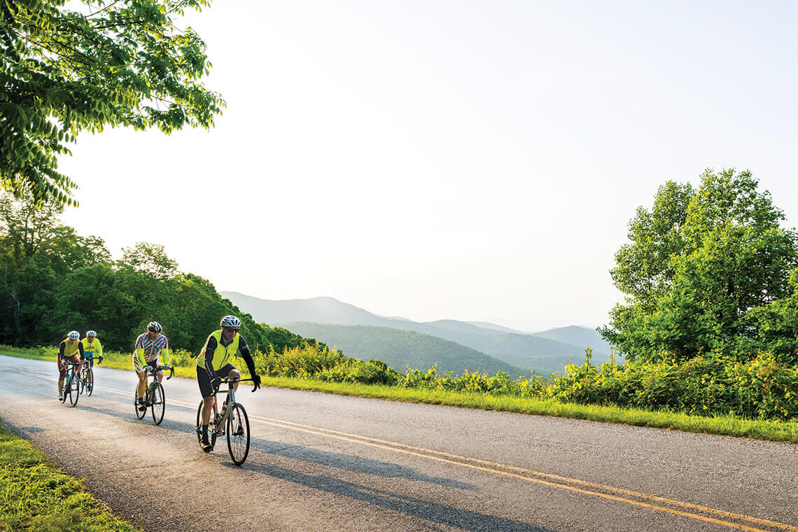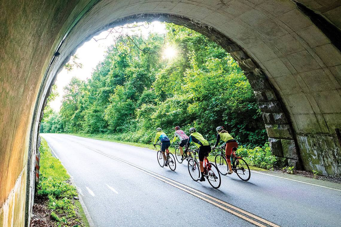 The writer and his friends — Randy Kirbo, Lara Hackett, and Mike Johnson — pass through the Pine Mountain Tunnel on the Blue Ridge Parkway on one of their regular sunrise rides, which start near the North Carolina Arboretum.<br><span class="photographer">photograph by Derek Diluzio</span>
