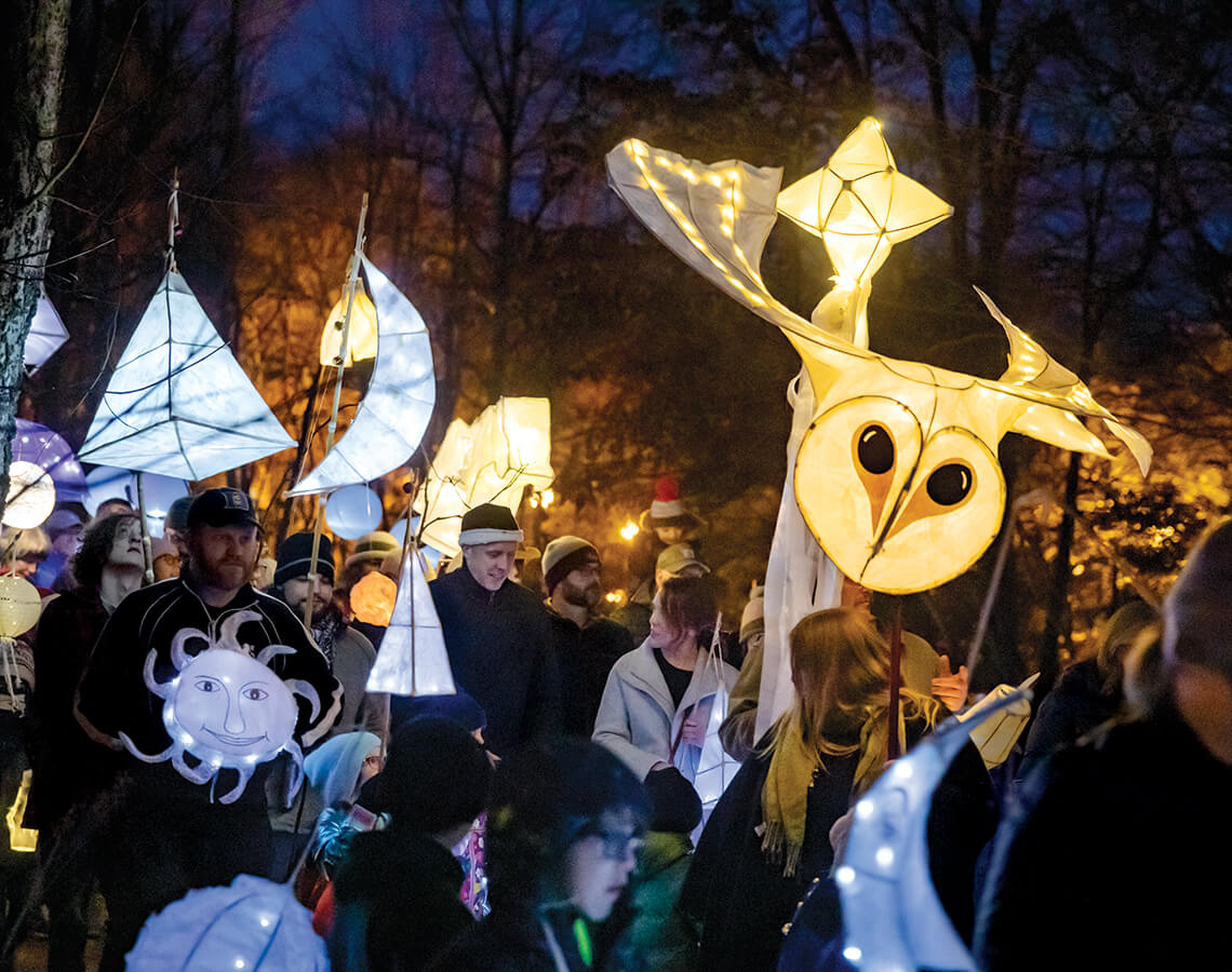 The town’s annual observation of winter’s arrival began, as so many good ideas do, with one person asking, What if? That person was sculptor Tinka Jordy. She envisioned a small group of her friends and neighbors gathering to mark the longest night of the year with a joyful observation of light and fellowship. Jordy had helped launch an earlier event, Hillsborough’s Handmade Parade, in 2008, inspired in part by her New Orleans roots and love of parades, and her involvement with the Cleveland Museum of Art’s Parade the Circle, a spirited celebration featuring handmade puppets, floats, costumes, and music. Six years ago, the annual Lantern Walk grew out of the Handmade Parade, which remains a biennial event.