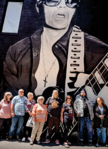 Wray’s descendants — including children Beth Wray Webb (third from right) in between Link Wray III (fourth from right) and Link Elvis Wray (in ball cap) — appeared in Dunn for the unveiling of the guitarist’s mural. photograph by Charles Harris