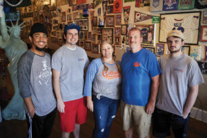Scott Gandolph (second from right) has a personality that’ll put a smile on anybody’s face, including those of his crew: (from left) Jamie Simpson, Julian Carey, wife Lisa, and son Bryce. photograph by Alex Boerner