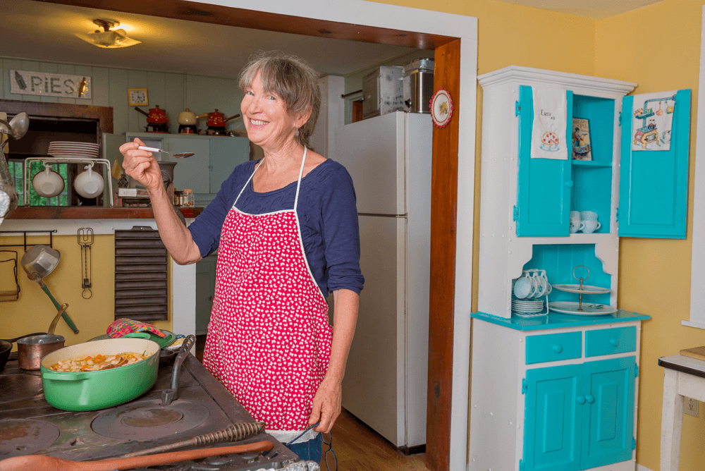 Cheerful and cozy, Swell’s log cabin kitchen appears to have come straight from a bygone era. Brightly colored feed-sack aprons — which she lends to students for class — hang from white hooks against one wall. Colorful bowls line the shelves above the sink, rolling pins fill a basket by the cupboard, and cast-iron pans of all shapes and sizes cover the stovetop. Outside the back window, Swell’s garden thrives, and sheets on the laundry line blow in the breeze.