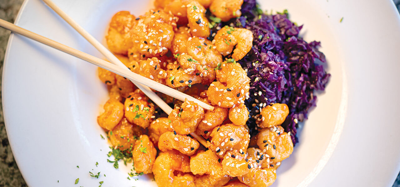 Sandy and Hallock stroll from the bar into the kitchen, chatting with employees, preparing for the day. Every stainless steel surface is immaculate, every cooking utensil in its place. They move on to the dining area, where colored lights and artist Trip Park’s Ralph Steadman-esque illustrations of mosquitoes hang from the walls, and windows look out over the bay. Then on outside, to the grassy area by the water, where customers wait for their tables and little mosquito sculptures sit next to playful signs that warn, “Don’t Feed the Alligators” and “Unattended Children Receive a Free Kitten.”