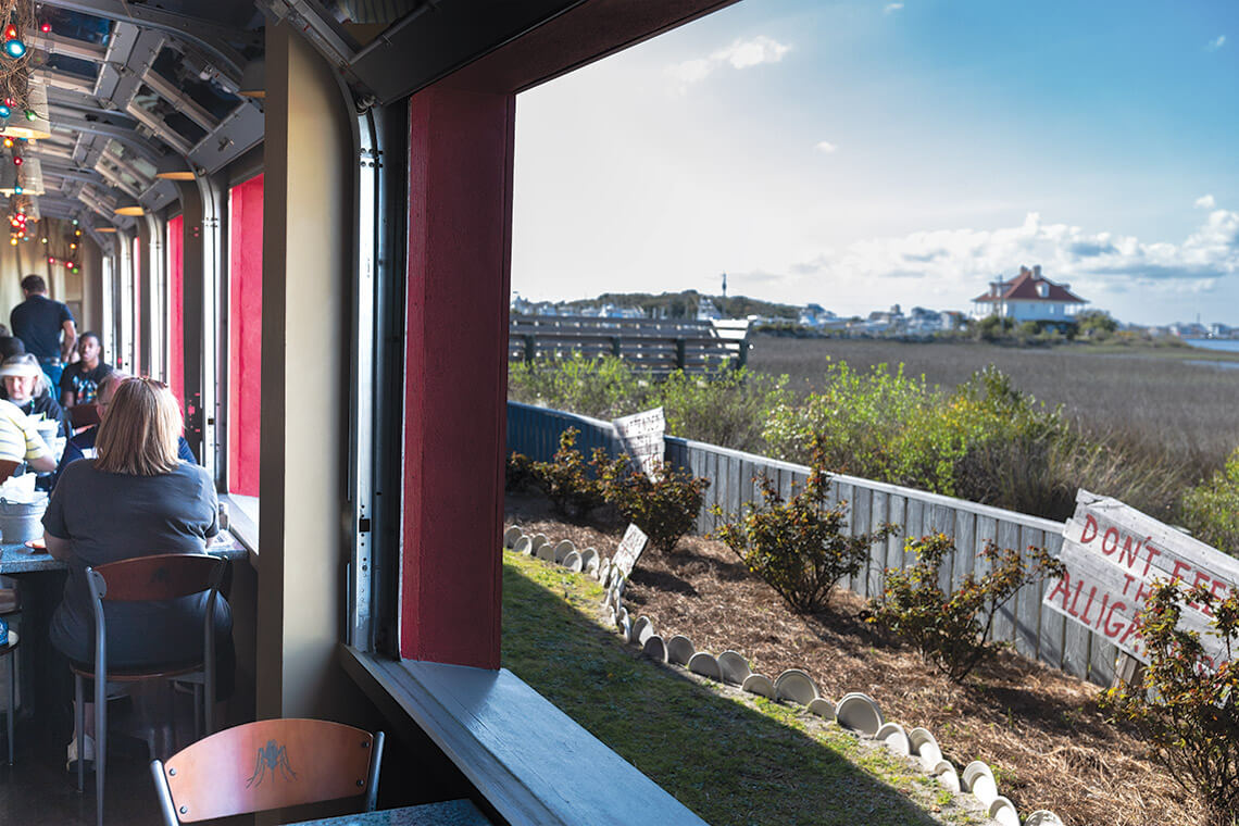 “The Oceanana was a hub for my family,” Hallock remembers now, 40 years later, a tinge of nostalgia in her voice. Sometimes life brings you full circle: These days, Hallock Cooper Howard owns Amos Mosquito’s, a casual but upscale restaurant that butts up against the marshes of Money Island Bay, directly across Fort Macon Road from her family’s old motel and pier. Now married with kids of her own, she operates the place with her husband, Sandy. His role: running the front of the house and welcoming visitors at the door as though he’s known them all his life. Hers: creating exquisite dishes like Amos’s shrimp and grits, with smoky andouille sausage, mushrooms, and green onions covered in red pepper broth over Cheddar cheese grits.