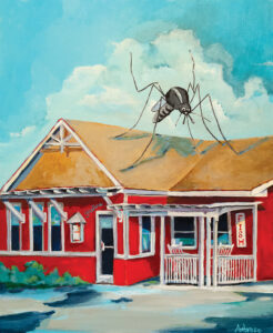Mosquito-inspired artwork — like this painting by Fran Ambrose — adorns the walls of Amos Mosquito’s. photographs by Fran Ambrose