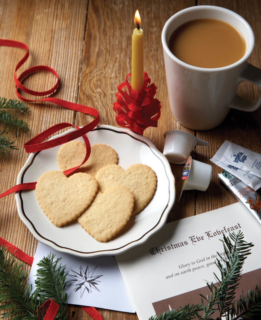 A candle, Moravian sugar cookies (they travel better than buns), coffee, and a program help faraway friends feel included. photograph by Matt Hulsman