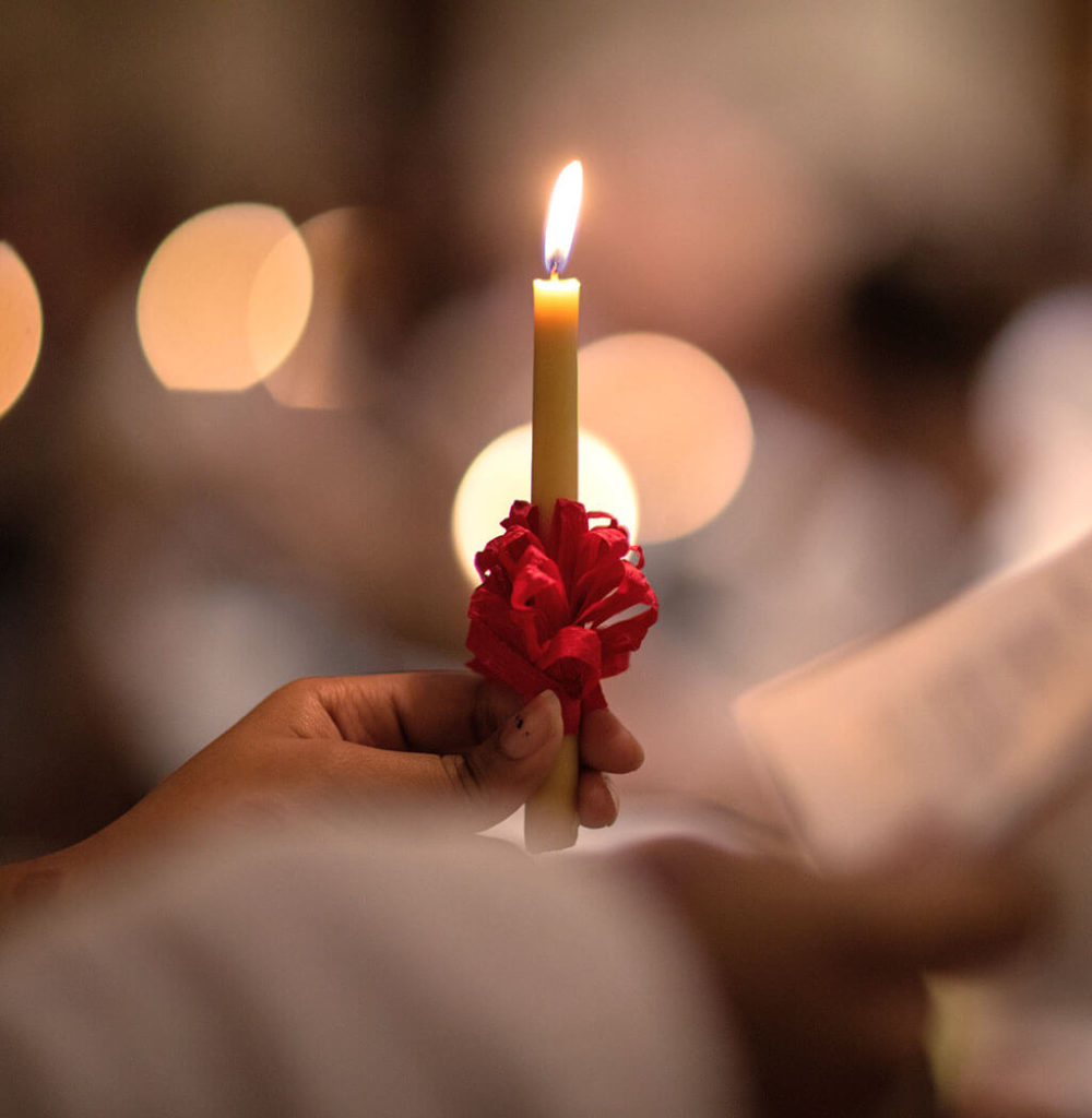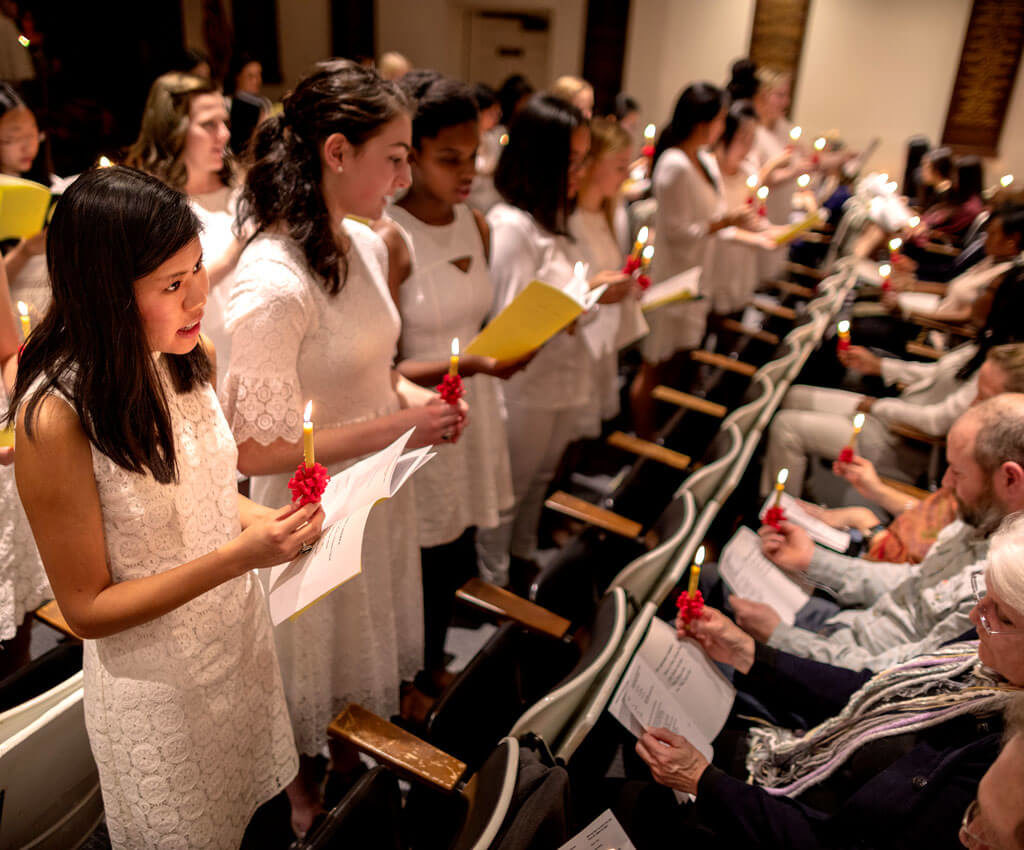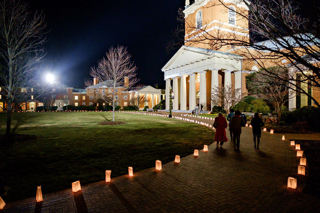 Feature Image: At the end of the lovefeast service at Wake Forest University, Wait Chapel transforms into a sea of light as worshipers lift their voices and their candles. To find lovefeast services across the state, click here.