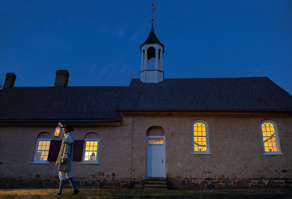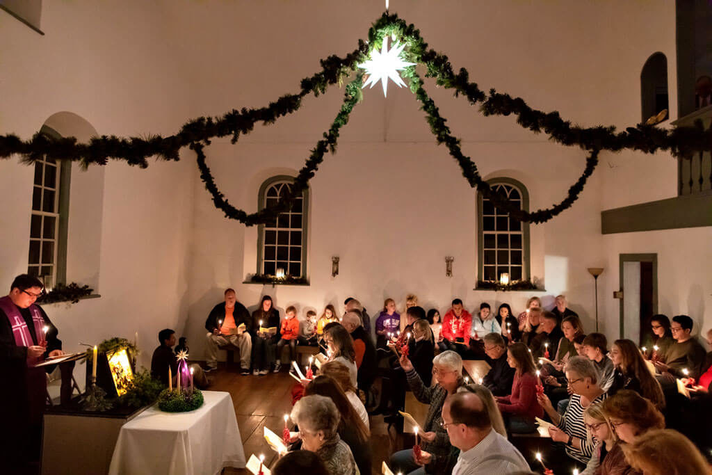 Many of the buildings at Historic Bethabara Park, including the 1788 Gemeinhaus — which once served as a church, meetinghouse, school, and minister’s quarters — have stood the test of time. Bethabara Moravian Church, too, traces its history back to the first 15 Moravians who settled here. Most Sundays, the congregation gathers in a newer, larger sanctuary. Except at Christmas.