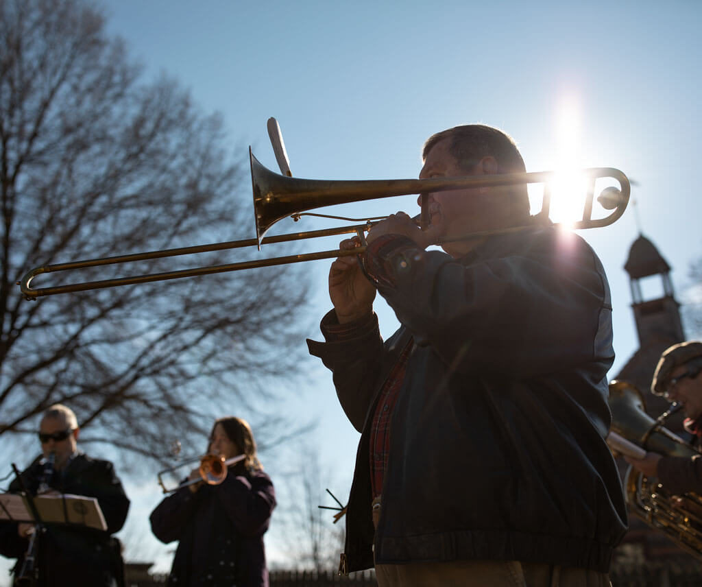 The Moravian Brass Band plays Christmas tunes on the lawn before lovefeast service. photograph by Jerry Wolford & Scott Muthersbaugh
