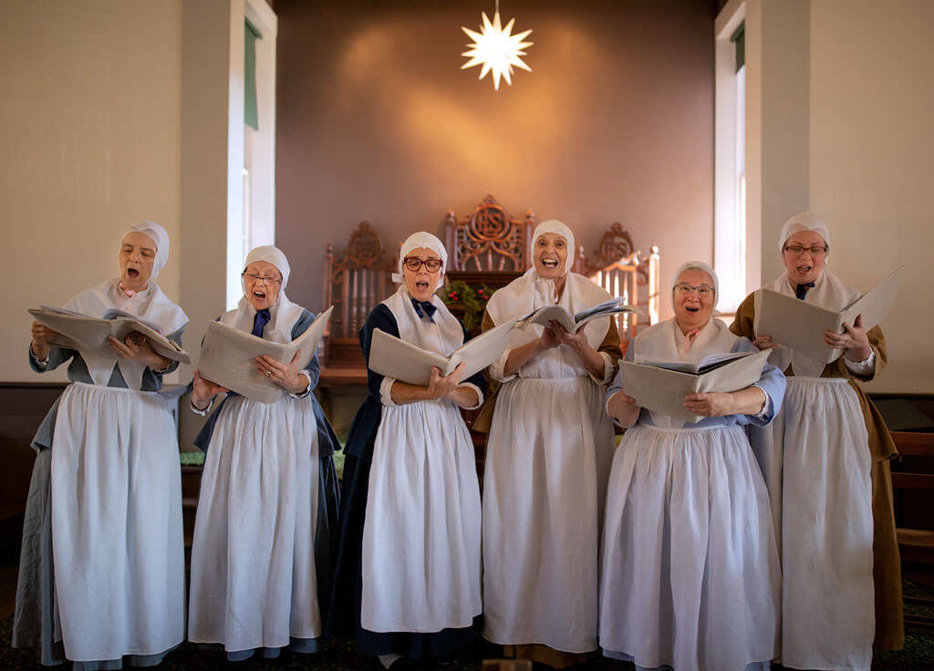 Song is deeply woven into Moravian history and culture — it was Moravians, for example, who first brought the trombone to the U.S., where brass instruments continue to play a prominent role in worship. A hallmark of the Christmas lovefeast at St. Philips is the special music that’s chosen to accompany the tea and buns. Last year, the Salem Singing Sisters wore their 18th-century best, down to the ribbons that once denoted a woman’s marital status.