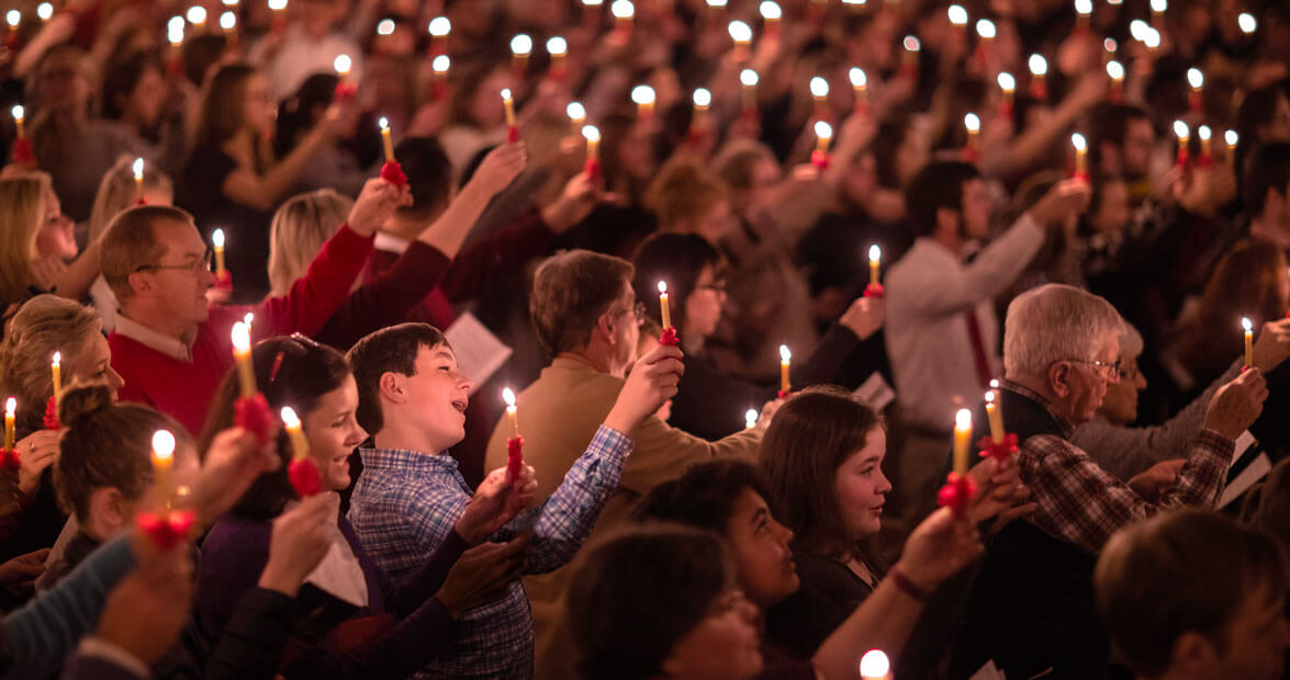 Feature Image: At the end of the lovefeast service at Wake Forest University, Wait Chapel transforms into a sea of light as worshipers lift their voices and their candles. To find lovefeast services across the state, click here.