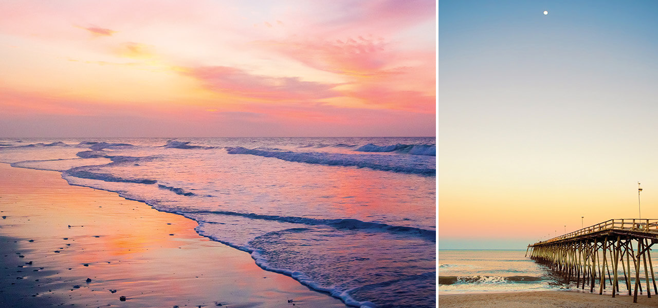 Sunrises and sunsets at the coast transform the Carolina blue sky into a multicolored masterpiece, best admired with toes in the sand or from Kure Beach Pier (right). photograph by WRIGHT AND ROAM
