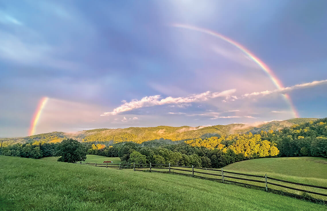 A nearly full rainbow over photographer Khia Myers’s land in Moravian Falls frames the foothills of the Blue Ridge Mountains in Wilkes County. photograph by KHIA MYERS