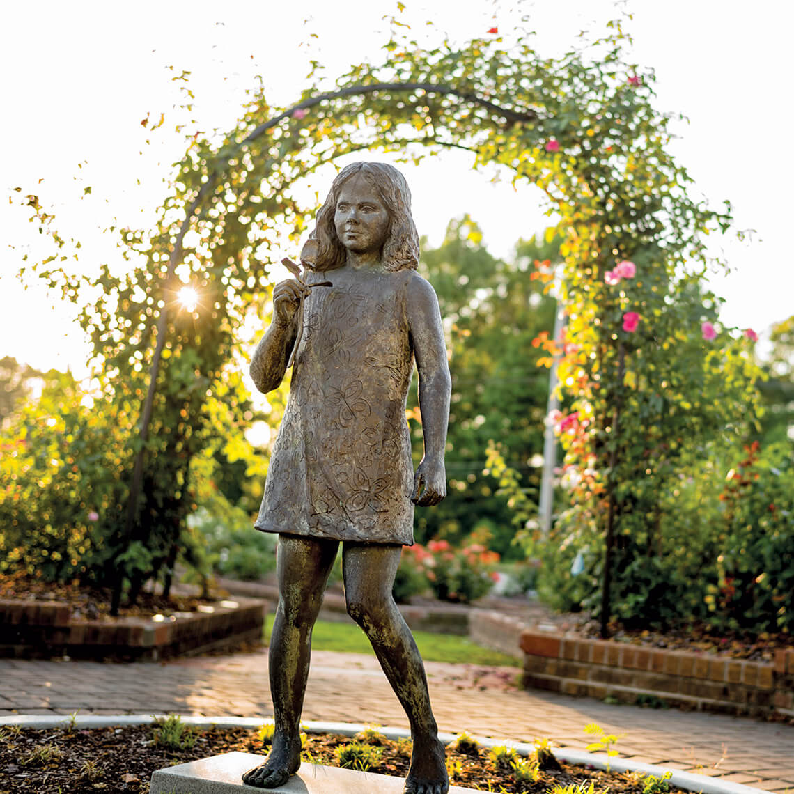 In the Fragrance Garden, Wilson sculptor Sherrod Duggan’s Child With Rose stops to smell the grandifloras. photograph by Charles Harris