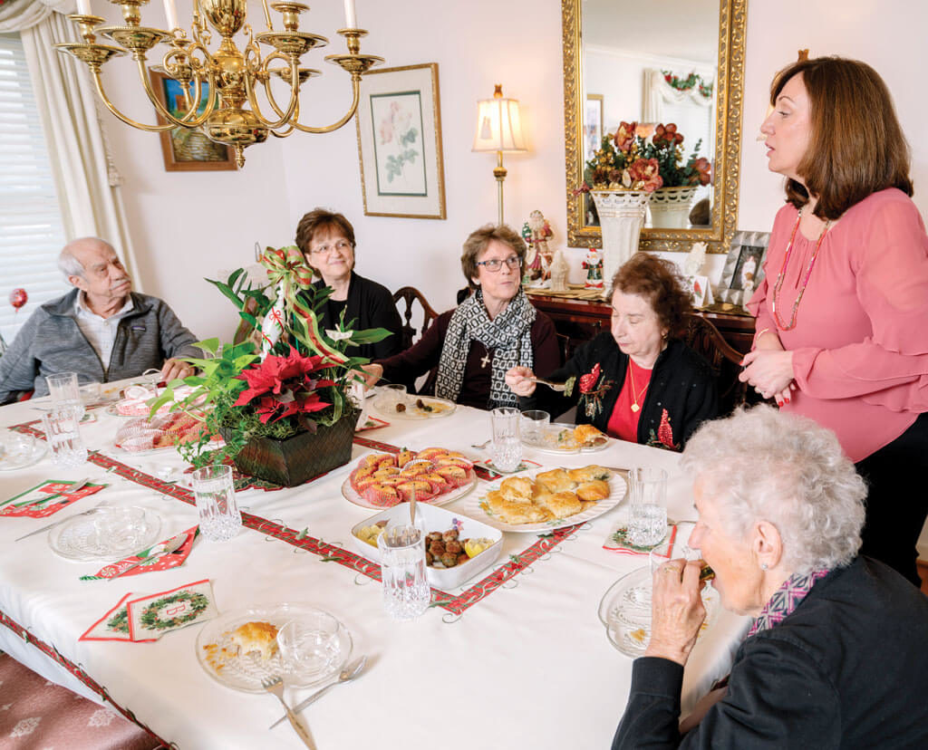 Friends and family gather at the Bouloubasis home to sample Greek desserts: (from left) Hercules Amprazis, Virginia G. Moutos, Betsy G. Vlahos, Rita M. Georgoulias, Lisa Bouloubasis, and Mary Pappas. photograph by Adam Mowery