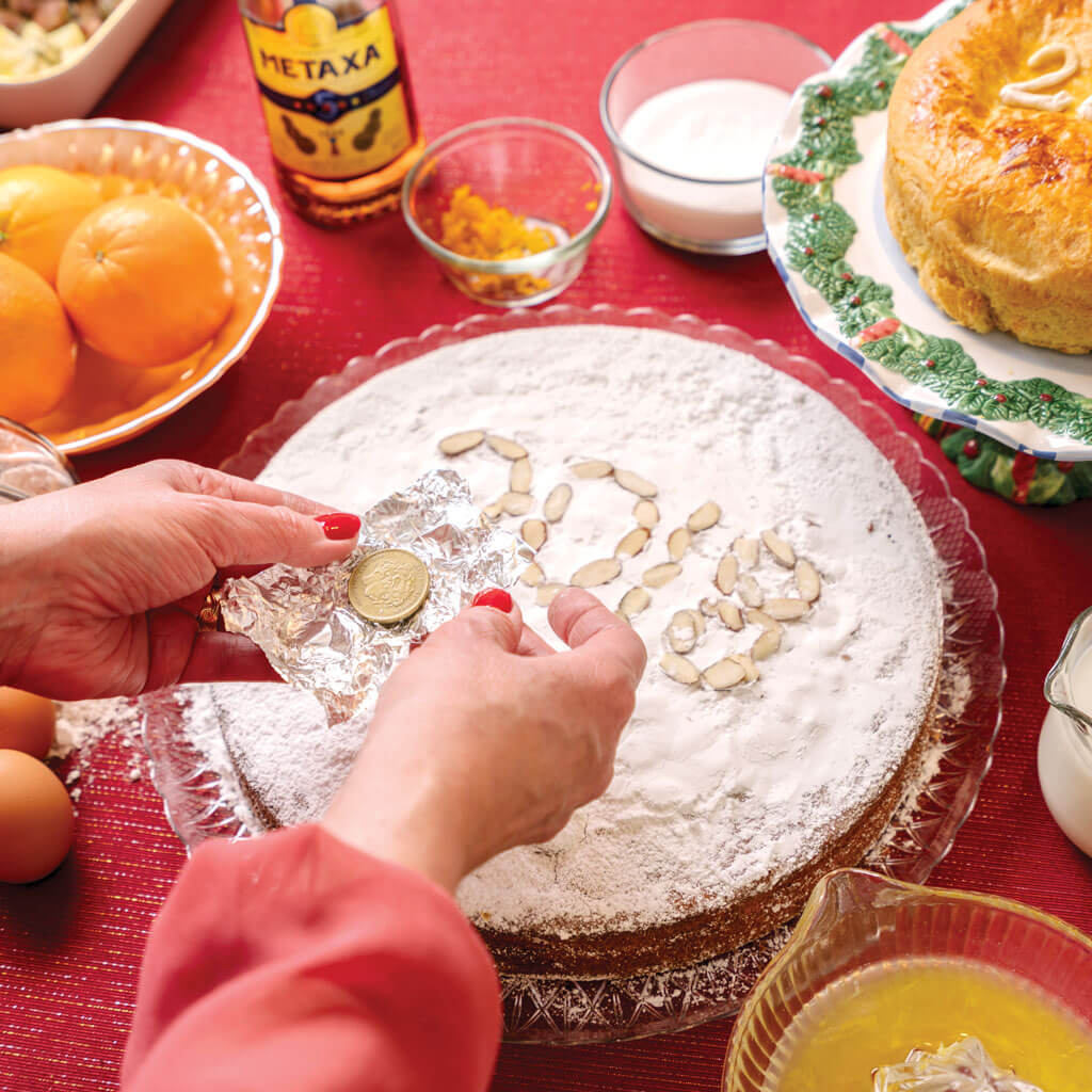 Dusted in powdered sugar and decorated with the new year shaped in gleaming white Jordan almonds or sesame seeds, vasilopita appears on Greek kitchen tables on New Year’s Day. Recipes vary by region, but my family’s version, which is common in Greek-American communities, has a coffee-cake texture with hints of orange and lemon zest. Tempting as it may be to dig in right away, everyone must wait for the family to gather first. The ritual in how we cut our vasilopita is rooted in the idea of earning extra blessings in the Greek Orthodox tradition. In my family, we start with the Holy Trinity: Father, Son, Holy Spirit. Each figure gets a slice, in that order. As a kid, I always hoped the coin would not be stuck in one of the holy slices — it would be too unfair! Not that I ever admitted as much out loud.