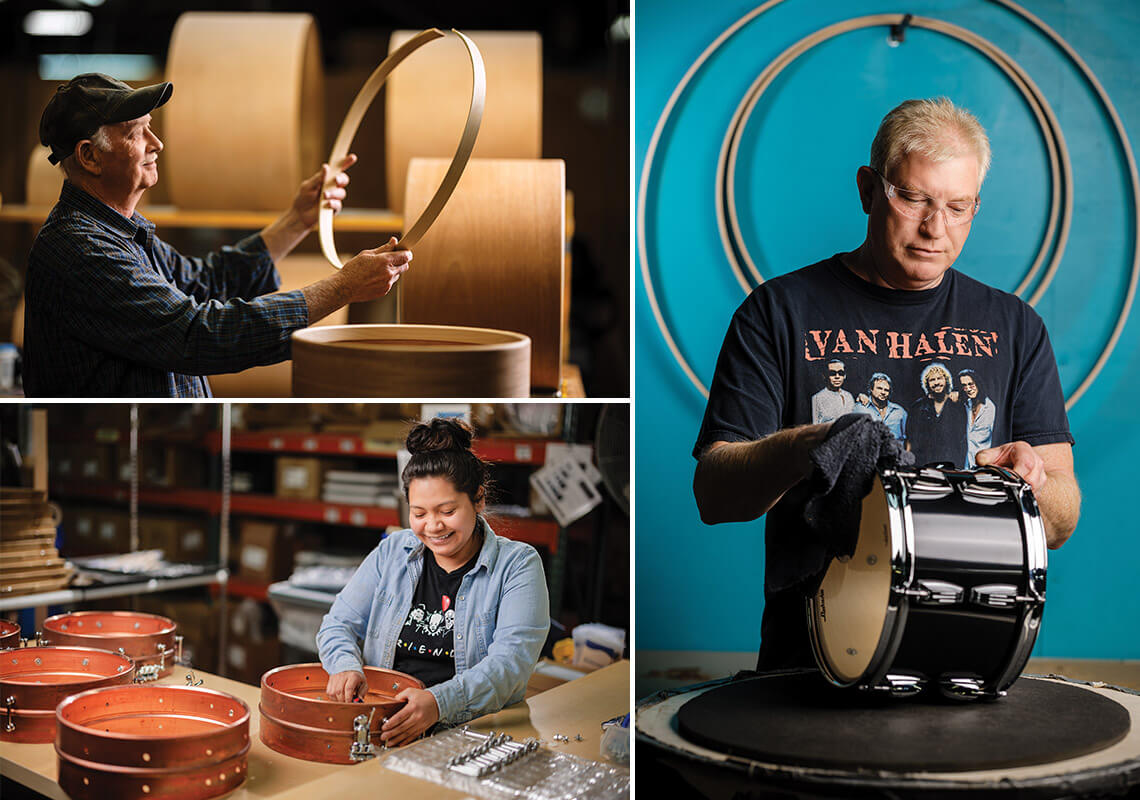 Counterclockwise from top left: Lloyd Benton, who’s worked for Ludwig for 17 years, assembles a drum at the Monroe factory; Mary Segura installs the hardware in one of the last steps in the process; and Dennis McCoy performs a final quality check. photograph by Jerry Wolford & Scott Muthersbaugh