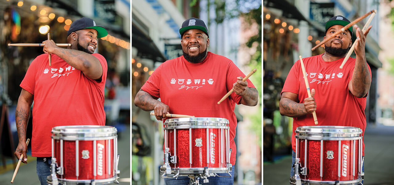 Thompson grew up in Brooklyn, New York, obsessed with perfecting “tricks” on BMX bikes and in-line skates and doing “anything that could grab people’s attention.” But when he saw his drummer friend Ralph Nader execute a “left-hand stick twirl” in front of their apartment building one night, the experience was every bit as life-changing for Thompson as seeing Ringo Starr on The Ed Sullivan Show was for earlier budding drummers. “I saw that, and I said, ‘Oh shoot, I got to learn this,’” Thompson says. Mesmerized by this new kind of “trick,” Thompson was soon a section leader in the Jackie Robinson/Brooklyn Steppers Marching Band.