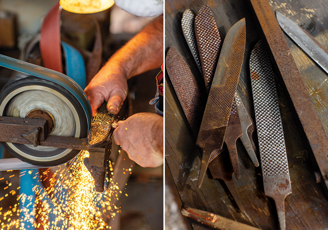The high-carbon tool steel that made a file or rasp reliable on the farm makes it dependable in the kitchen, too — after Robinson grinds it into the shape of a knife. photograph by Tim Robison