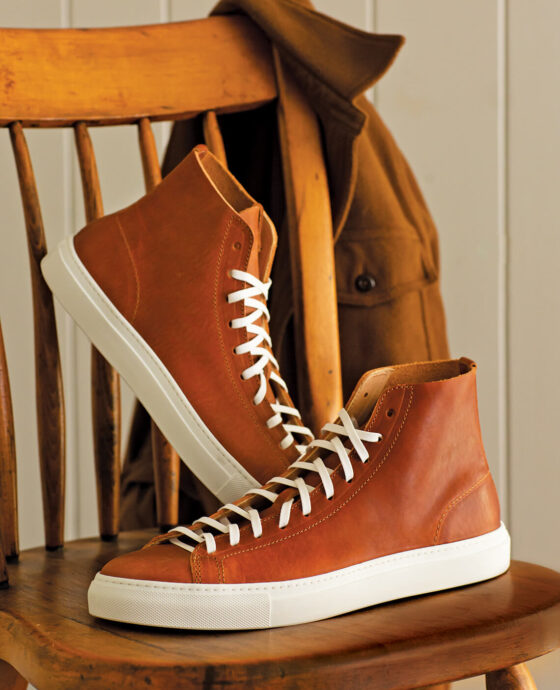 That symbolic approach to footwear is something the Jameses contemplated at length before launching Opie Way in November 2019, and it carries through in styles like Riverside Hi, the rich brown leather high-top shoe that won this year’s Made in NC Award in the style category. The company’s two lines of men’s and women’s low- and high-top sneakers (Haywood and Riverside) are made from either vegetable-tanned leathers that age beautifully or military canvas, much of which is procured from former North Carolina textile mills. “I think when you buy a pair of shoes, they should be worth what you paid for them, and they should keep for a long time,” Justin says, adding that if customers wear through the soles of their Opie Way sneakers, they can send them back for repair so they can keep on wearing them.
