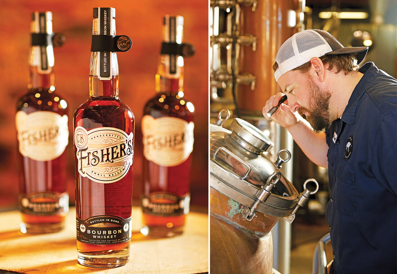 When he named his distillery, Andrew Norman knew that he would have some explaining to do: “Fainting goats have always been a family mascot,” he says. “It started on Thanksgiving; our family would watch videos of fainting goats for hours on end. They remind us not to take ourselves too seriously, and when you fall down, you can always get back up.” In 2015, Andrew and his father, Bill, opened Fainting Goat Spirits in Greensboro. The two pride themselves on handcrafting their liquor from grain to glass, using fresh North Carolina corn, rye, and malted barley to make all of their spirits, including C.B. Fisher’s “Bottled in Bond” Bourbon. Aged for four years in an American white oak barrel, the bourbon contains undertones of toasted pecans, Honeycrisp apples, and browned butter in every sip.